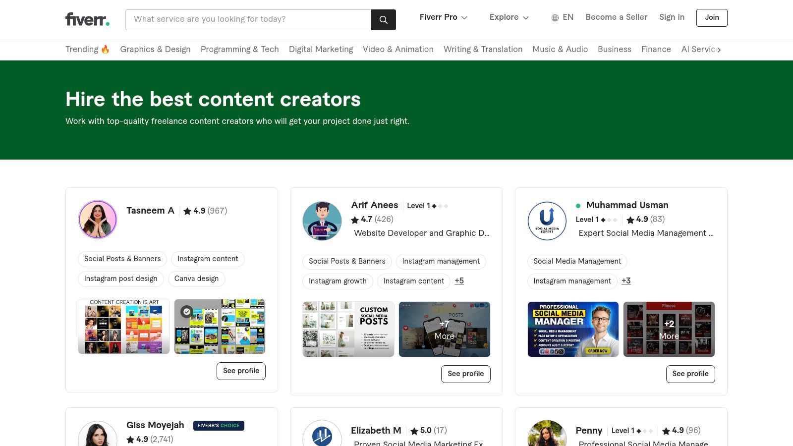 Fiverr’s marketplace is structured around specific service categories, making it simple to find UK-based or international talent for distinct content needs. Popular specialisms include: