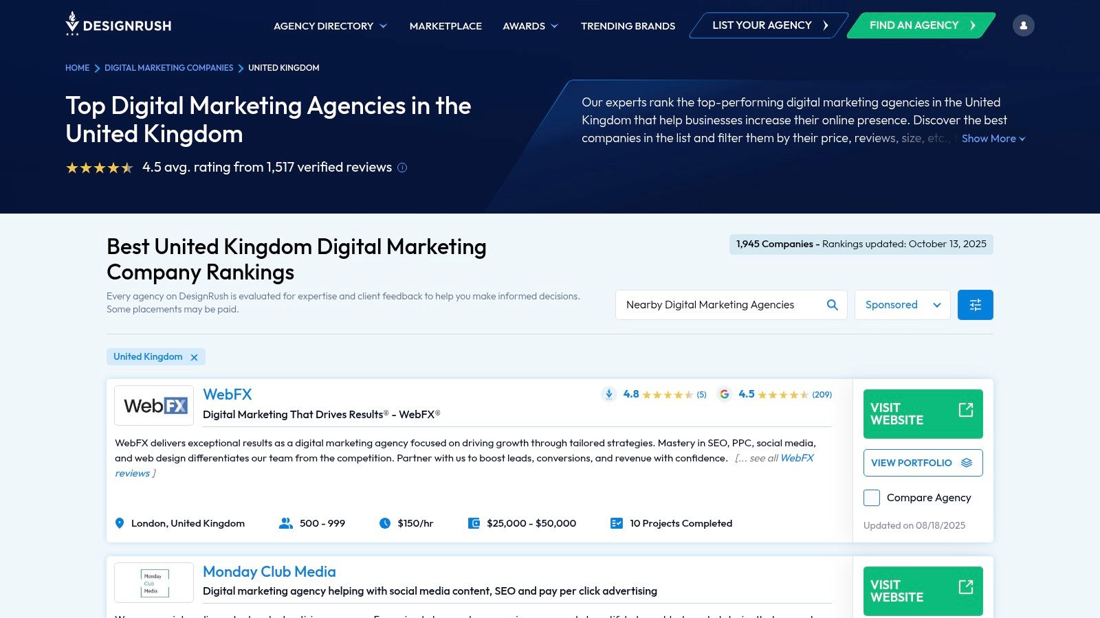 DesignRush is another leading B2B marketplace that connects businesses with professional agencies but it sets itself apart through its strong editorial curation. While functioning as a directory it also provides editorially vetted rankings of the best digital marketing agencies UK , giving businesses a pre-qualified list to start from. This approach combines the breadth of a directory with the focused insight of an industry award list, highlighting agencies that have a proven track record.