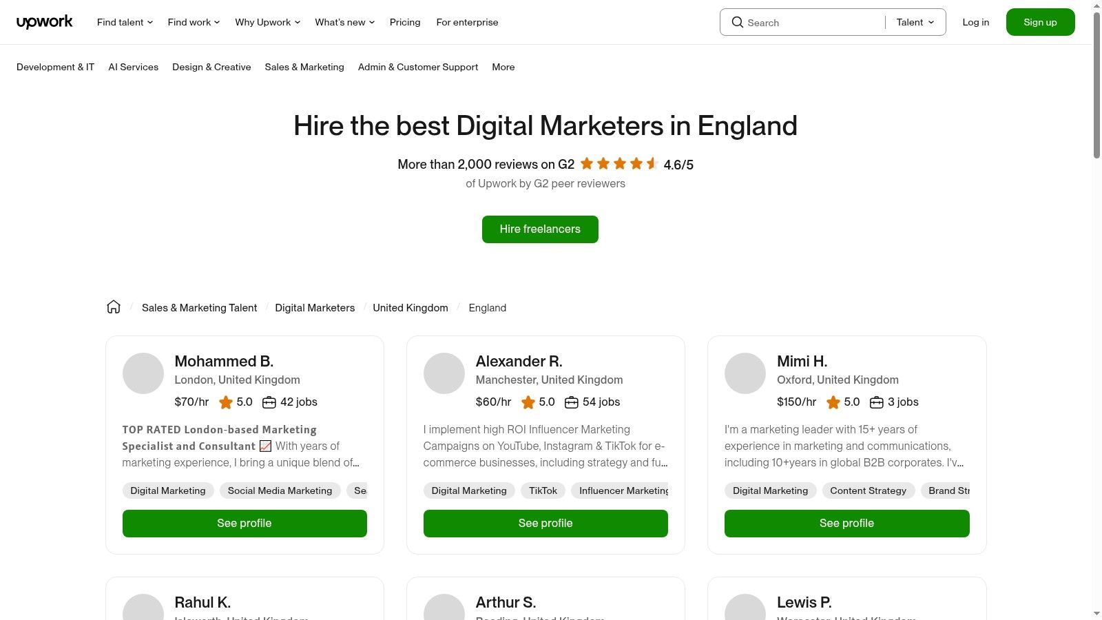 Upwork – Hire UK Marketers | Low to medium - freelance marketplace | Variable - depends on hires and contracts | Variable - depends on freelancer quality | Hiring flexible UK-based freelancers or boutique agencies | Fast proposals, payment protection, localized talent |
