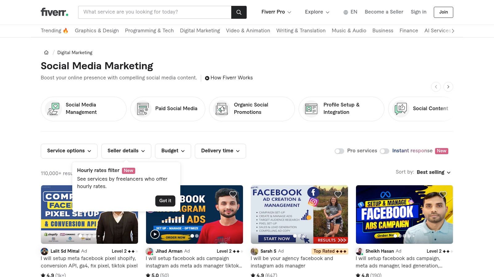 Fiverr’s interface is designed for rapid sourcing and hiring. The Social Media Marketing category is vast, but powerful filters allow you to narrow down the options efficiently. This makes it a great starting point if you're exploring how to find the best social media marketing agency for smaller, defined tasks.
