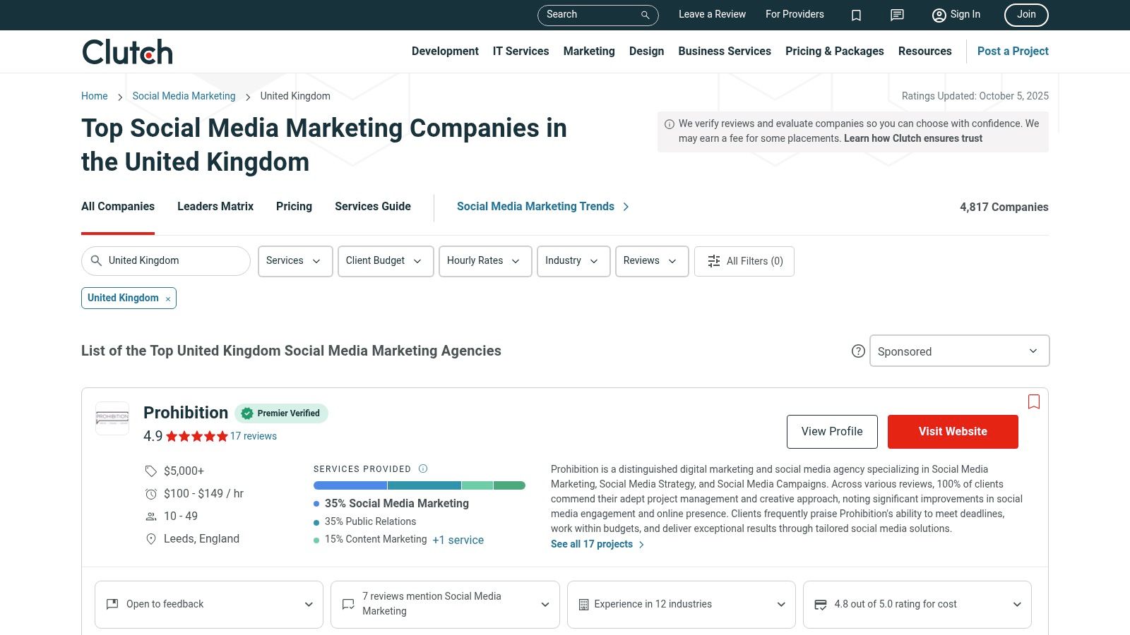 - Services: Filter specifically for "Social Media" to see agencies with validated experience in this discipline.