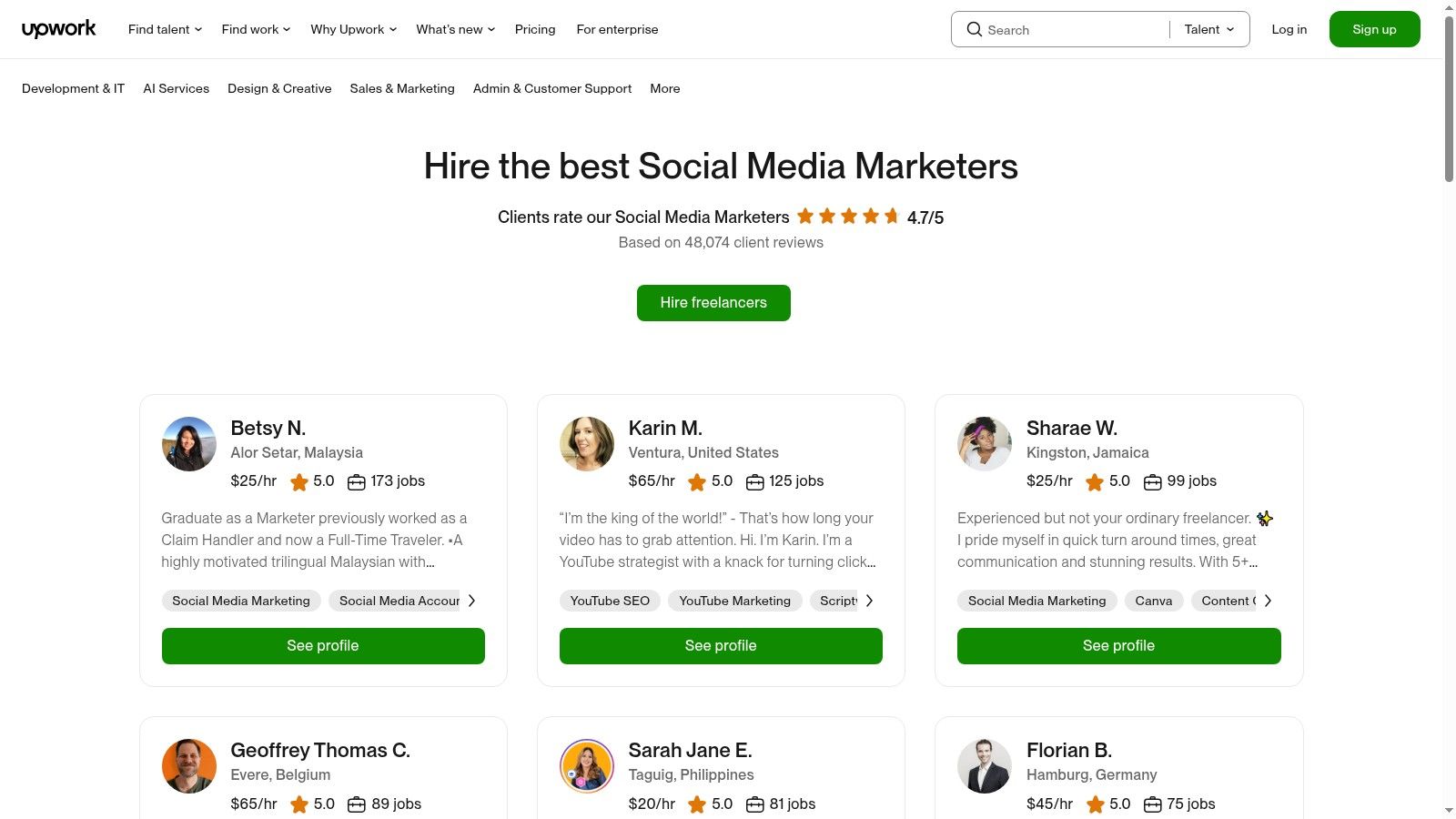 Upwork is designed to make hiring remote talent straightforward and secure. Its talent pool is its primary feature, showcasing experts in every niche of social media marketing, from TikTok strategy to LinkedIn B2B lead generation. The platform offers robust tools to manage the entire hiring lifecycle.