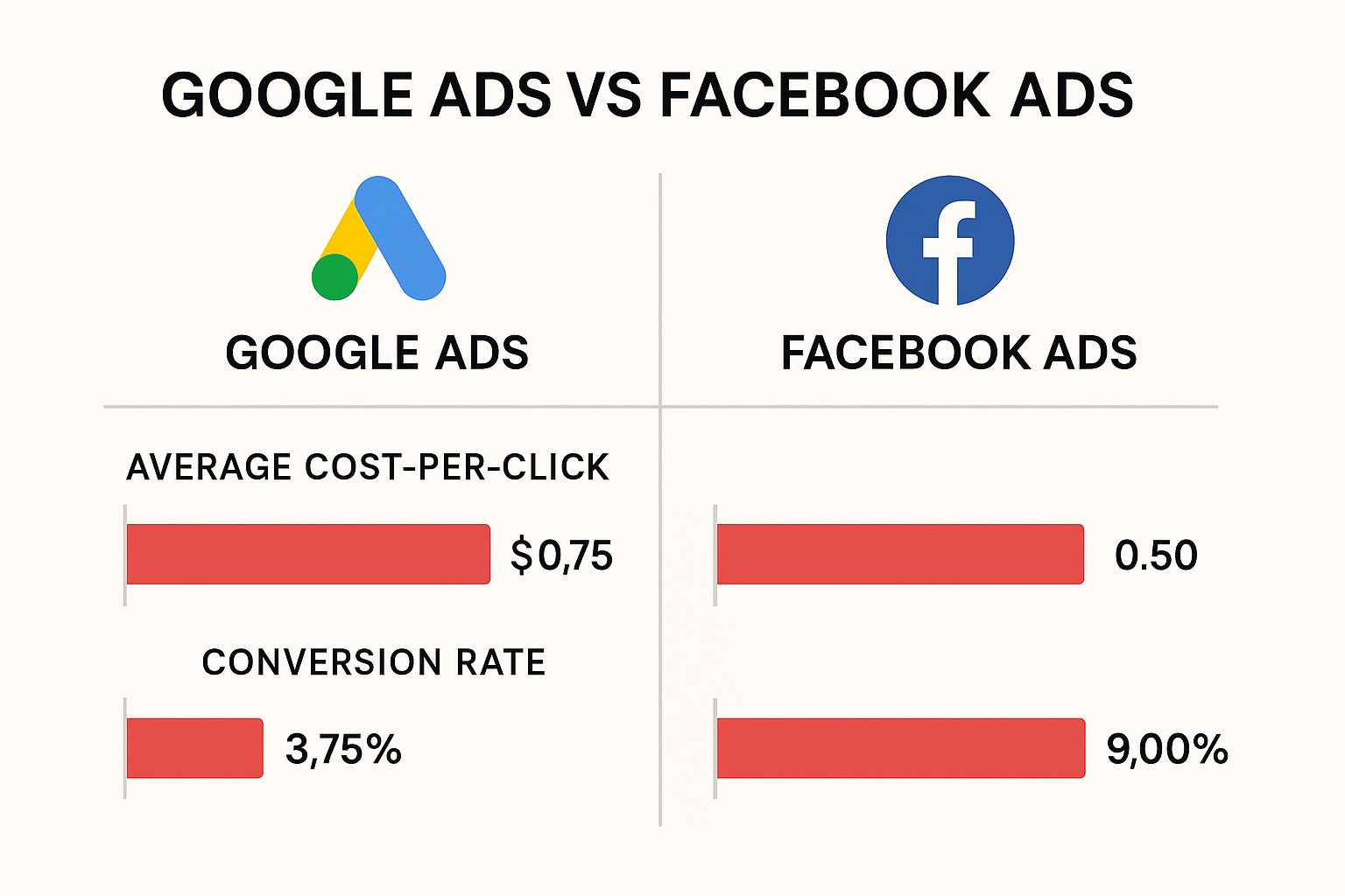 As the numbers suggest Google Ads often drives higher conversion rates because users are actively searching for what you sell. On the other hand Facebook Ads can offer a lower cost-per-click, making it a brilliant tool for building brand awareness and reaching new audiences.