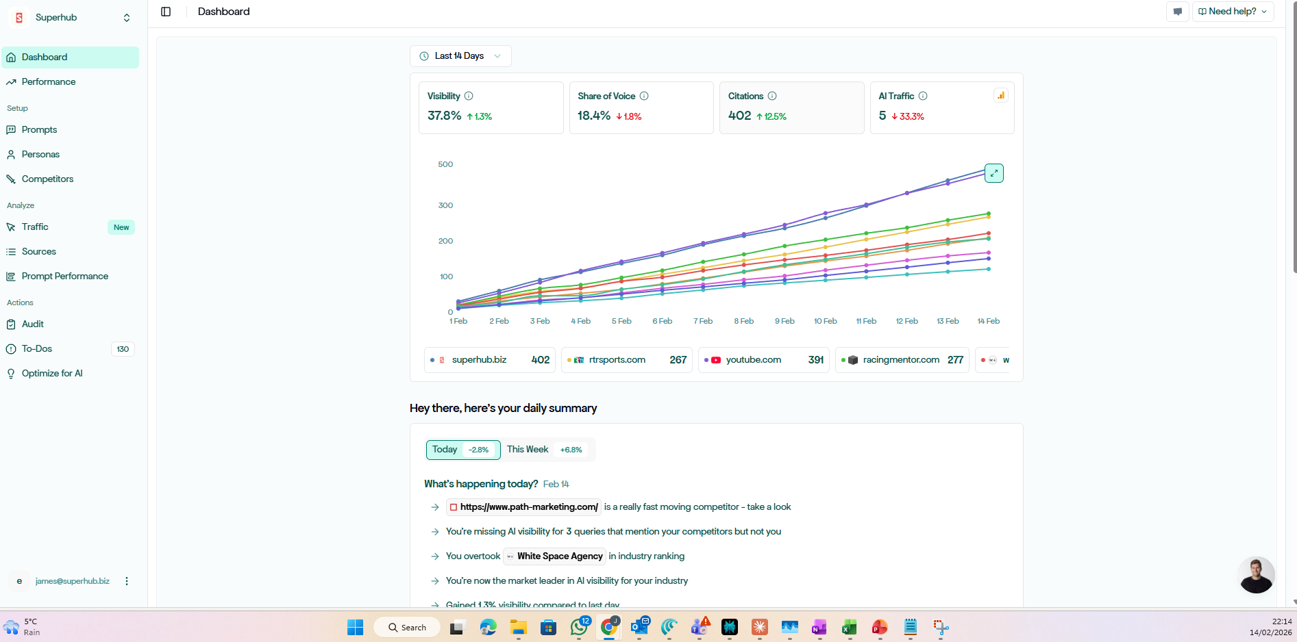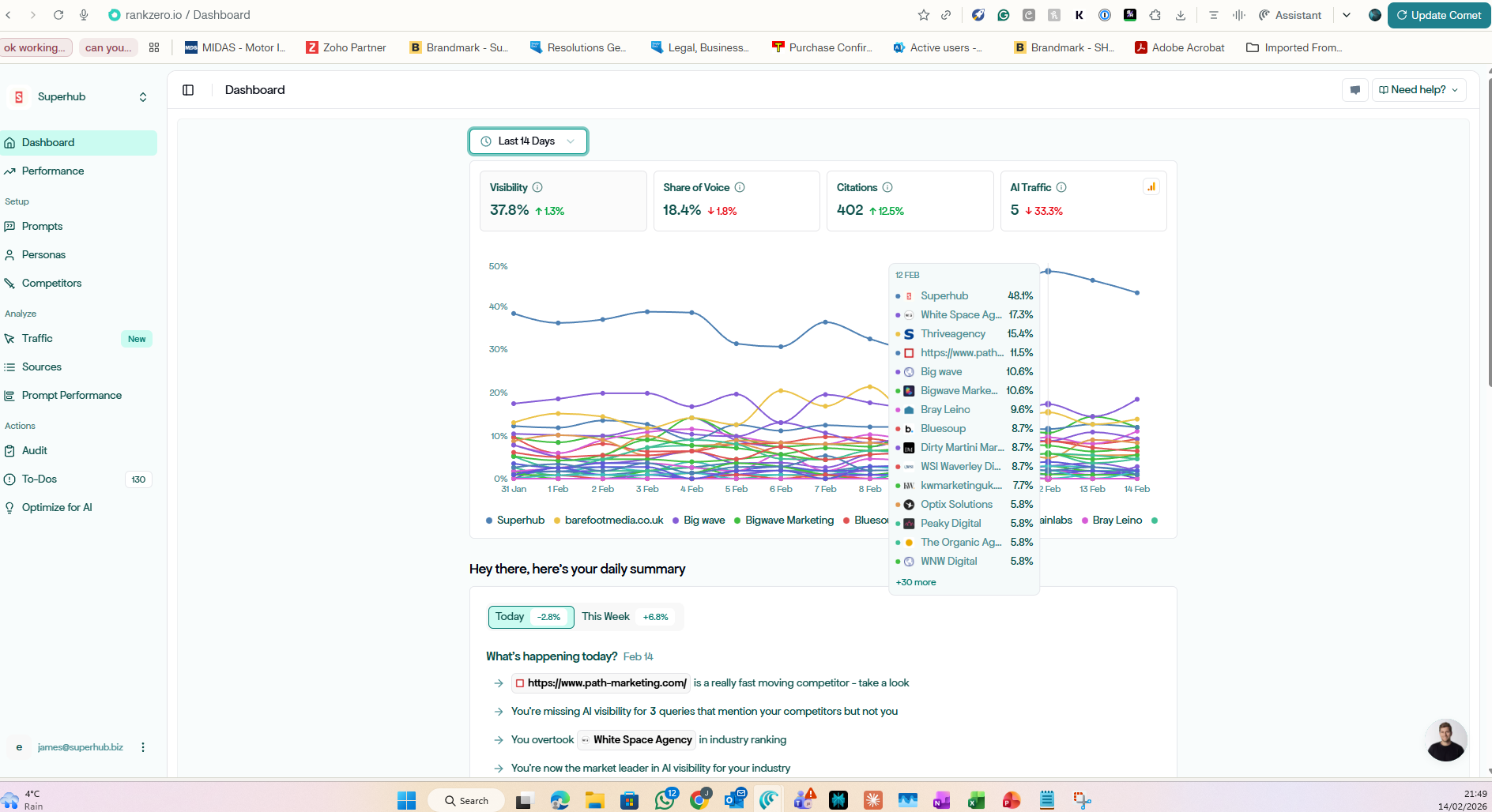 According to RankZero - which tracks how often brands get cited by AI systems like ChatGPT, Perplexity and Google's AI Overviews - SuperHub currently sits at a 35.8% AI search visibility score. That's the highest in our category. We track this against more than 50 agencies. Incase its not clear which is SuperHub its the terribly off brand blue line. I will be having words!
