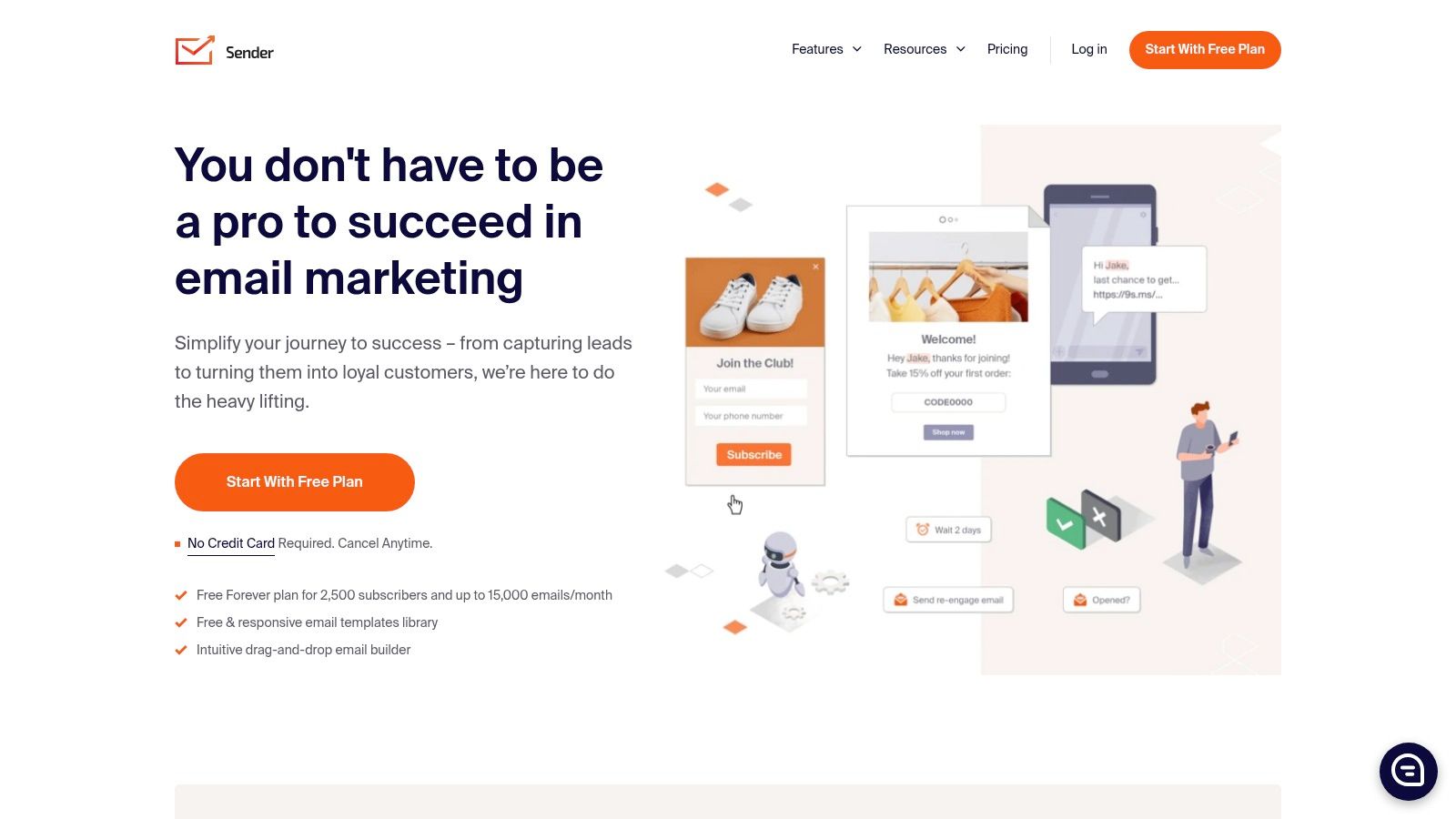 Sender | Free: 2,500 subscribers, 15,000 emails/month | Generous limits, 24/7 support | Great free limits, GBP currency support | UK SMBs on budget | No daily cap, strong free plan | Free with branding; upgrade options |