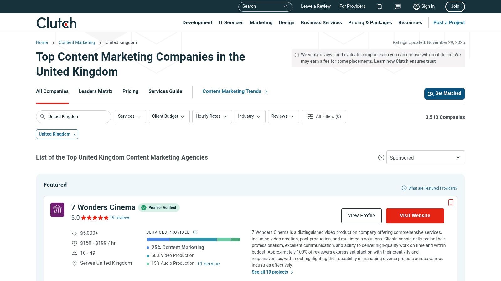 While some premium placements on the site are sponsored, the core review data remains impartial. By using the filters and diving deep into the verified feedback, Clutch offers a reliable and efficient way to create a shortlist of credible UK content marketing partners.