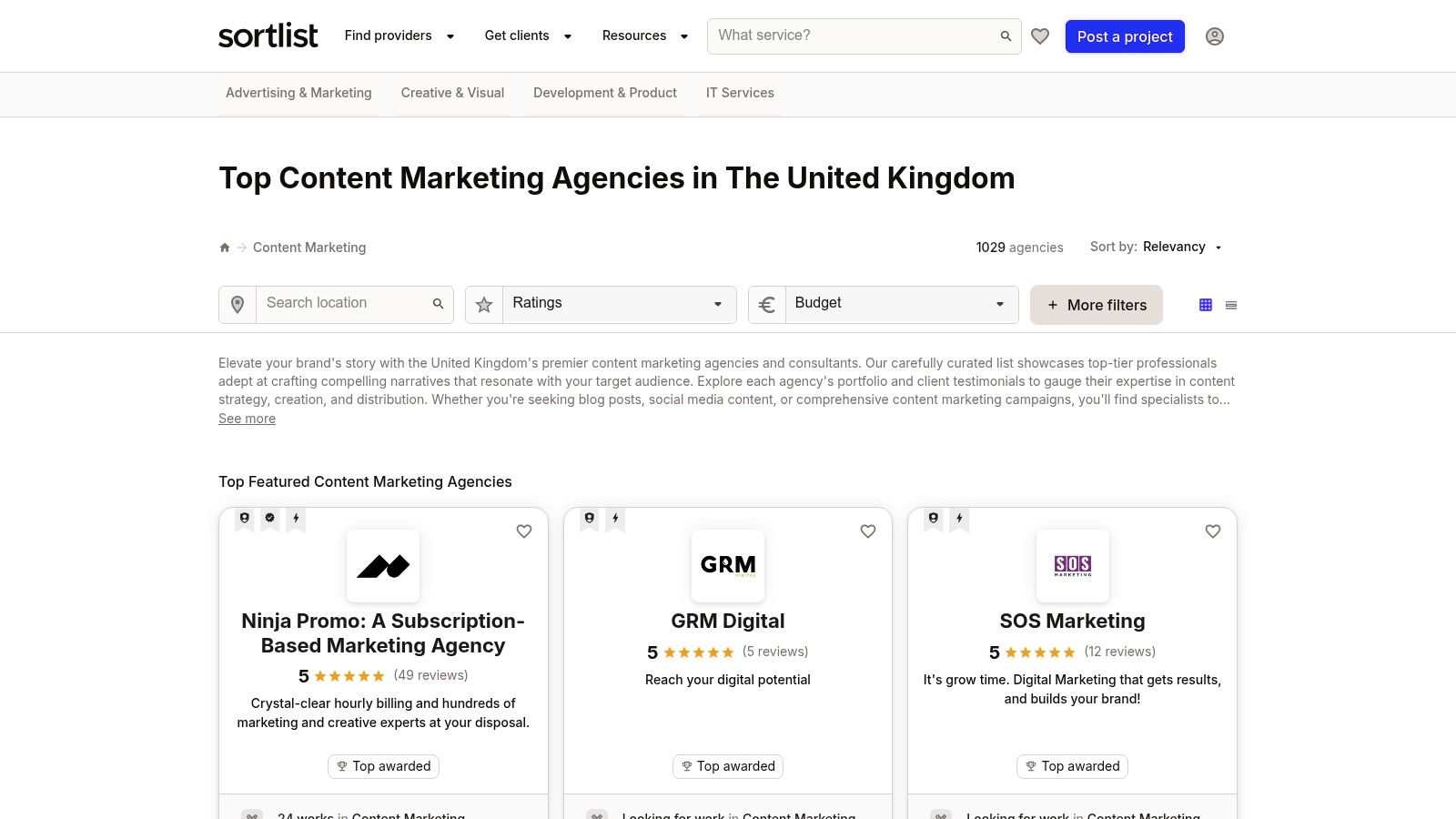 Sortlist offers a hybrid approach, combining a traditional browsable directory with a guided matchmaking service designed to simplify the agency selection process. For businesses that prefer a curated introduction rather than conducting mass outreach, Sortlist streamlines finding suitable content marketing agencies UK -wide. You can post a project brief and the platform will connect you with a handpicked shortlist of agencies that fit your requirements.