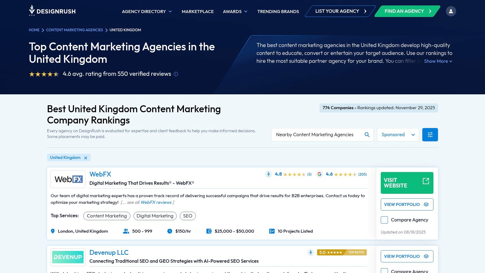 DesignRush is another high-value B2B marketplace that simplifies the process of finding and vetting the UK’s top creative and marketing talent. It functions as a curated agency directory, offering detailed profiles that go beyond a simple name and number. For businesses looking for content marketing agencies UK -wide, it provides a one-stop-shop to compare firms based on their expertise, client feedback and industry focus, helping to ensure a good fit from the outset.