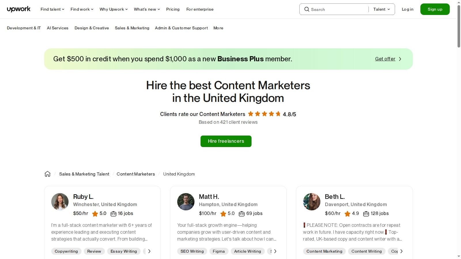 For businesses seeking flexibility or needing to supplement an in-house team, Upwork offers a different approach to sourcing talent. It is a global freelancing platform where you can directly hire individual UK-based content strategists, writers and editors or even find smaller, specialised boutique agencies. This model is particularly effective for businesses with specific, short-term project needs, smaller budgets or those wanting to test a new content direction without committing to a long-term retainer.