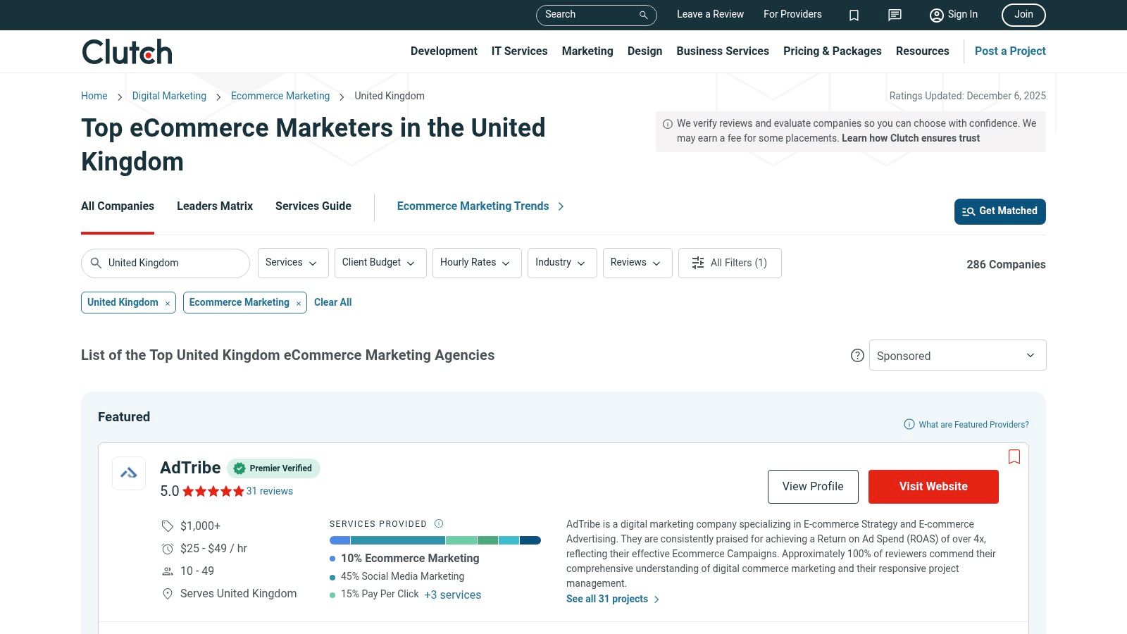For businesses seeking a broader market view beyond a single platform, Clutch.co is a leading B2B directory renowned for its verified client reviews. It offers a comprehensive, UK-specific ranking of ecommerce marketing companies, making it an invaluable resource for due diligence and creating shortlists for requests for proposals (RFPs). Its core strength lies in aggregating genuine client feedback and presenting it alongside key agency data.